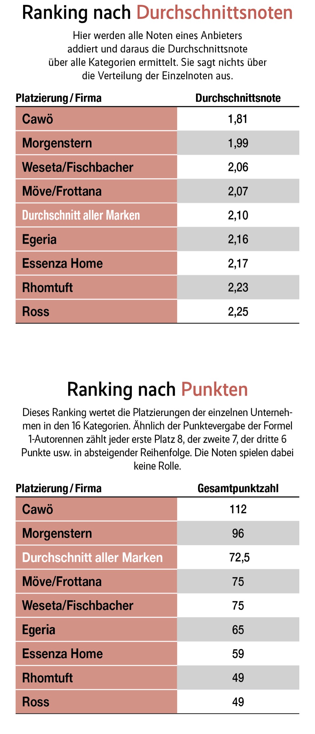 Auf den Rängen fünf und sechs tauschen Egeria und Essenza Home die Plätze. Mit einer 2,16 liegt Egeria wiederum nur hauchdünn vor Essenza Home mit einem Schnitt von 2,17, kann sich aber insgesamt stärker verbessern. Im vergangenen Jahr lag der Notenschnitt des Tübinger Unternehmens noch bei 2,27. Schlusslichter nach Durchschnittsnoten sind Rhomtuft auf Platz sieben mit einer 2,23 sowie Ross auf dem achten Rang mit einer 2,25. Immerhin ist es Ross gelungen, sich von seinem zwischenzeitlich schlechtesten Wert der vergangenen Jahre (2,34) wieder etwas nach vorne zu arbeiten.