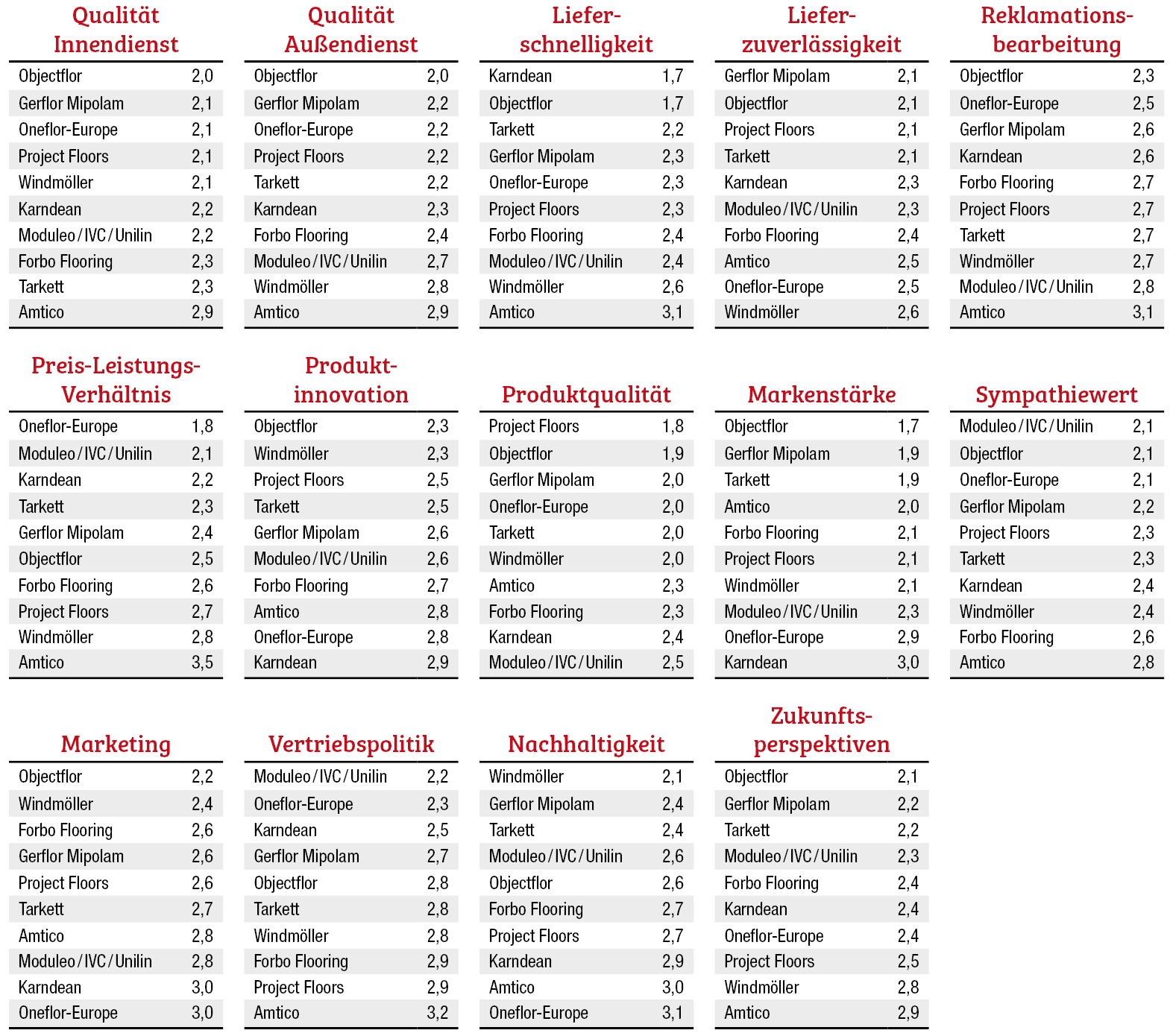 Als Vertriebstochter von Objectflor konzentriert sich Karndean ausschließlich auf Private-Label-Produkte, weshalb Markenstärke kein Fokus ist. Folgerichtig belegt der Lieferant hier den letzten Platz, ebenso im Marketing, aber auch bei der Produktinnovation. Doch bei der Lieferschnelligkeit glänzt Karndean mit einer Top-Bewertung und liegt gleichauf mit der Muttergesellschaft. Beim Preis-Leistungs-Verhältnis sichern sich die Kölner den dritten Platz. Die Vertriebspolitik von Karndean wird überdurchschnittlich bewertet, was sich im Vergleich zur Konkurrenz positiv abhebt. Der gute Service wird mit einer Silbermedaille in der gleichnamigen aggregierten Kategorie belohnt.