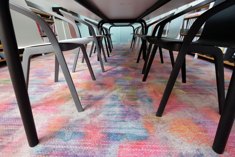 Ein extravagantes Design zeigt der neue Teppichboden in den Büros: Der farbig-aquarellige Eyecatcher stammt aus der Kollektion Carpet Creations der Halbmond Teppichwerke, die mit der Hightech-Digitaldruckanlage Colaris umgesetzt wird. Mit nur wenigen Grundtinten lassen sich hochauflösende, kontrastreiche und scharf konturierte Designs in nahezu grenzenloser Farbvielfalt erstellen, und das bereits ab Losgrößen von 20 m
